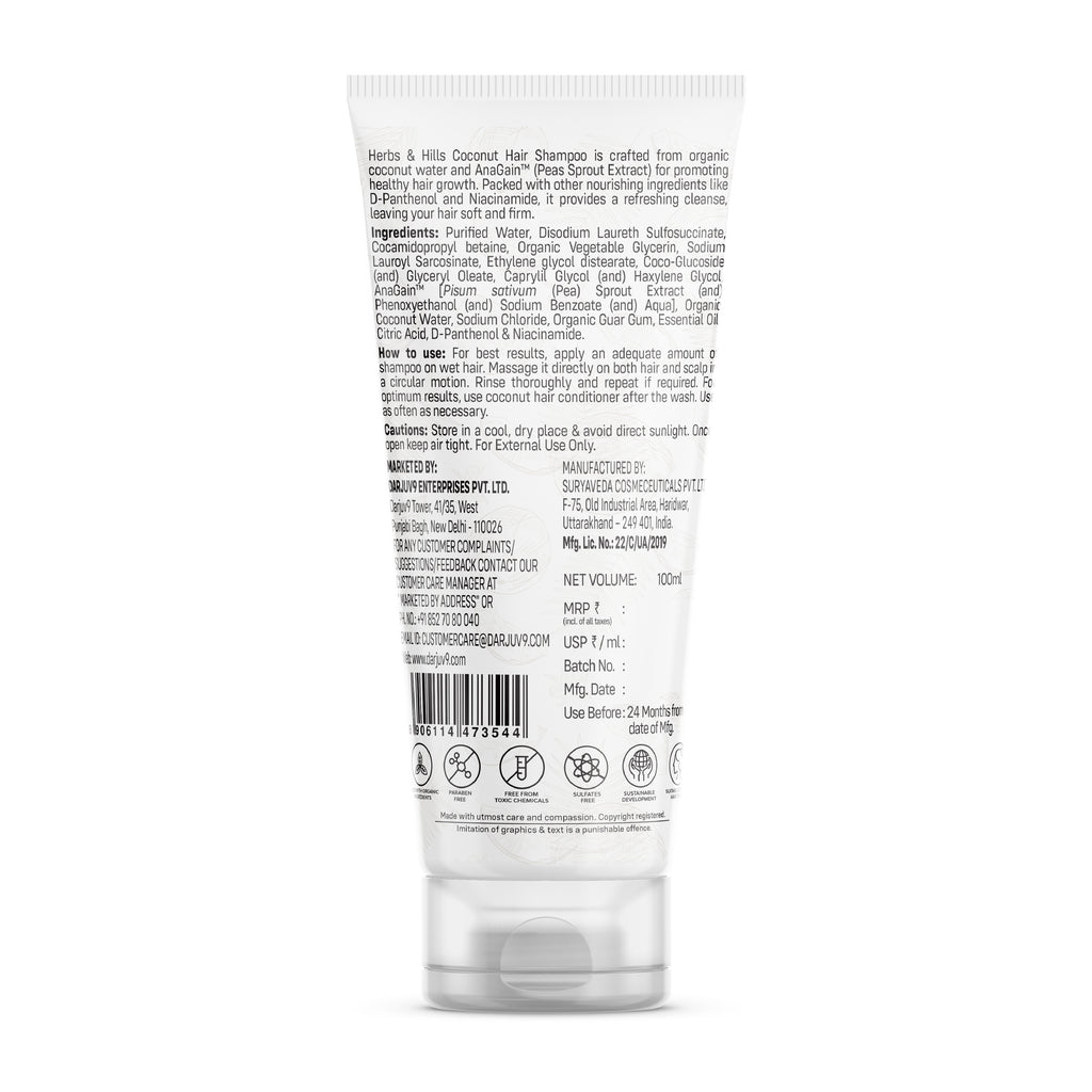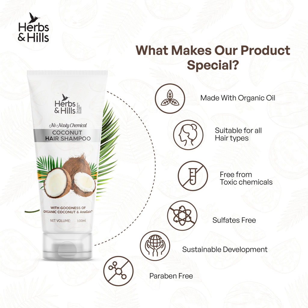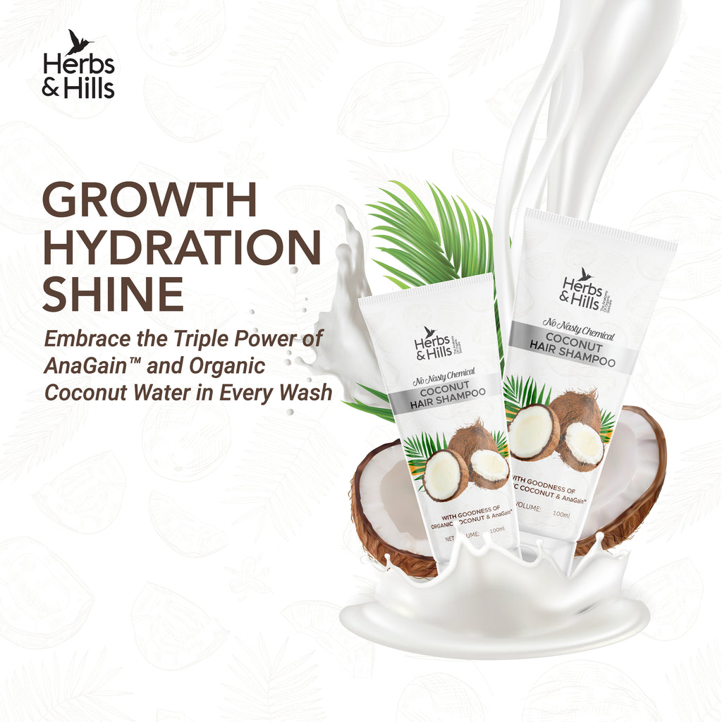 Herbs & Hills Coconut Hair Shampoo is a revolutionary blend of high-quality ingredients crafted to elevate your hair care routine. Immerse yourself in the enriching power of organic coconut water and AnaGain™, meticulously combined to deliver a transformative experience for your hair.